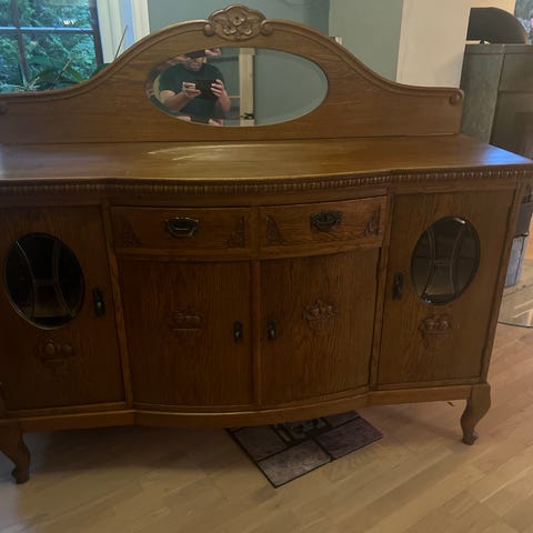 Fin brun antikkskjenk selges- fint brukt. Noen få små hakk, lite synlig på forsiden av skjenk. Ellers pent brukt. Bud mottas. må hentes.