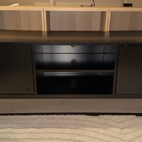 To åpne hyller i midten, og skap på hver side. God plass til spill og diverse.