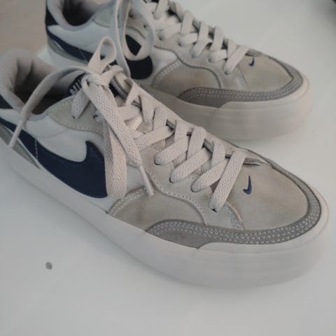 Nike Sneakers joggesko i størrelse 38. Skoene har en kombinasjon av hvit og lyseblå farge. De er brukt et par ganger og er i fin stand, ikke uttråkket og fortsatt «harde» og har ingen spesifikke bruksmerker. Må fortsatt gåes ut.