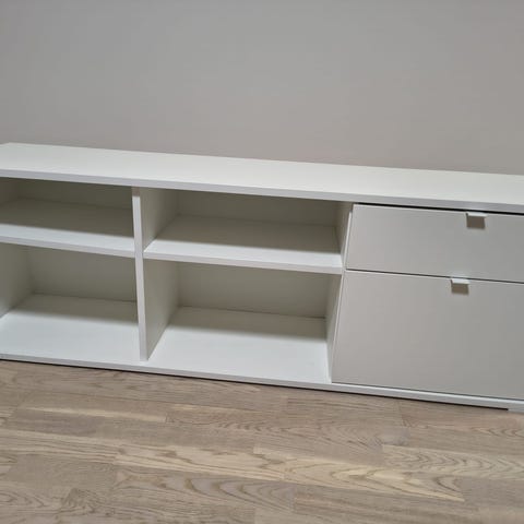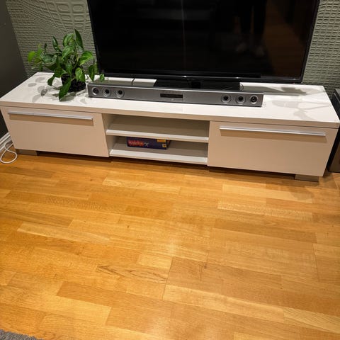 TV-bord / TV-benk med 2 hvite hengslede dører med barnesikringer. Usikker på møbelprodusent da den fulgte med ved kjøp av leilighet. Henges opp på vegg med 4 skruer. Må hentes.