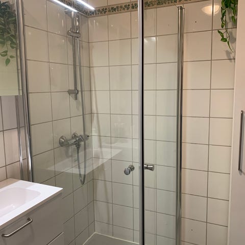 Dusjhjørne med glassvegg og dør. 90x90 cm. Høyde 200 cm