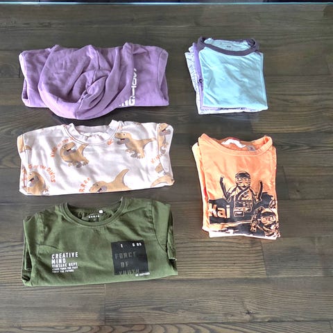 Klespakke til gutt i str 122/128. Noen plagg er merket 122/128, mens begge buksene er 128, og ene generen er merket 122. Har vært brukt samtidig hos oss.