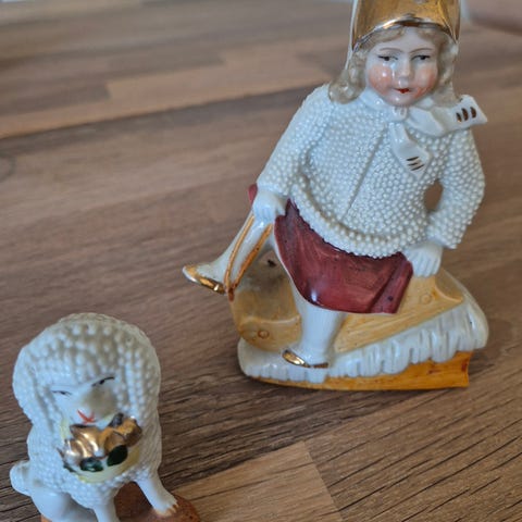 Sjelden flott rødhette bisque figur. Plass til en liten blomst i holderen.