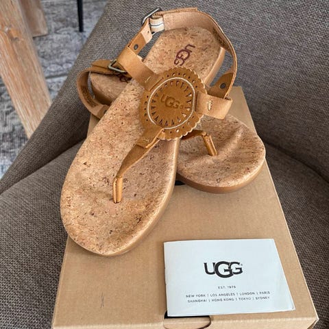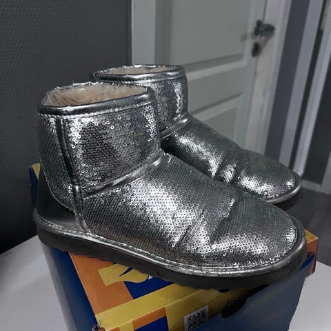 UGG barnesko i størrelse 38, unisex modell. Skoene har en sølvfarget overflate med paljettdetaljer og er foret med mykt materiale for komfort.
