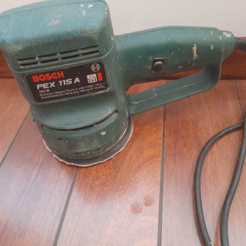 Bosch PSM 80 A eksentersliper med støvpose. Elektrisk verktøy for sliping og pussing. Grønn farge, kompakt design med håndtak for enkel bruk.