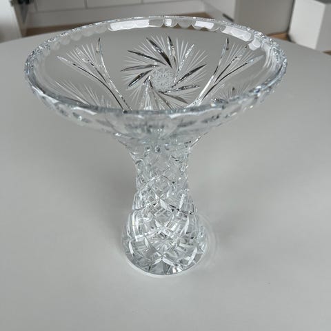 Det er bittelitt bruksspor, mikronag på kanten, litt luftbobler fra produksjon, men fremstår veldig flotte. Det lille fate er i samme mønster, ca 24 cm langt men er usikker på om det er krystall . Befinner seg I Hedalen, kan tas med til Langhus etter avtale.