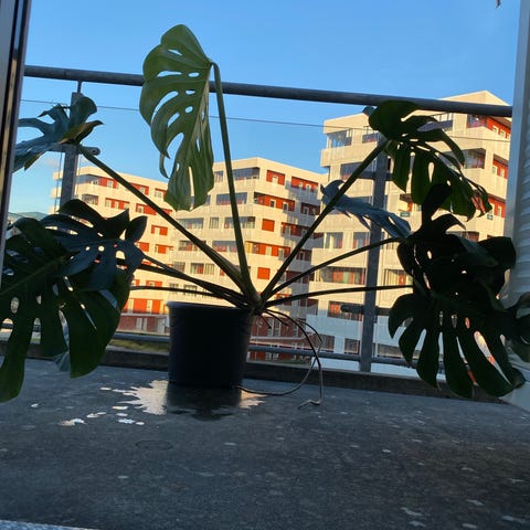 Monstera Deliciosa er en stueplante med store, karakteristiske grønne blader med naturlige hull. Planten passer til innendørs bruk for dekorasjon og luftforbedring.