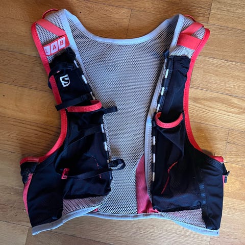 Pent brukt løpevest. Lett og sitter veldig bra på. Har mye mer plass enn Adv Skin 12. Også et mye mer solid stoff - ikke vanntett, men tåler en del mer vann og slitasje. Uten softflasker. Sømmen til kanten av mesh-stoffet har gått litt opp to steder - se bilder. Har lappet et bittelite hull - se bilde.