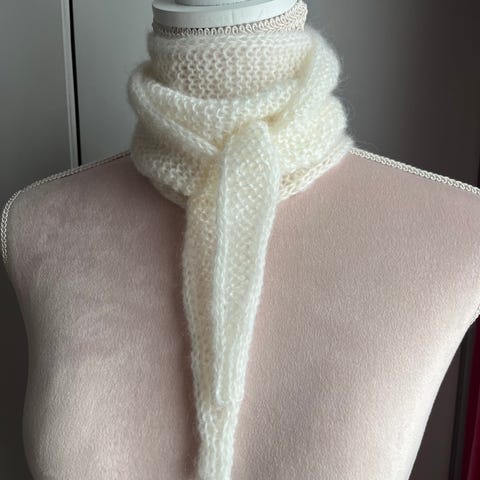 Hvitt ca 125-130 cm. Bredde på midten ca. 17 cm. Strikket i Mini Mohair. Kr. 225,-