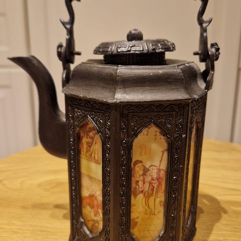 Tekanne i sølv med dekorative mønstre. Tekannen har lokk med hengsel, en buet tut og et håndtak. Den står på fire små føtter og er egnet til servering av te. Flott orientalsk objekt.