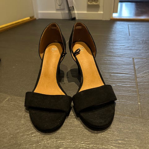 H&M hæler i størrelse 39, beige farge. Skoene har åpen tå, glidelås på forsiden og stiletthæl. Designet for kvinner.