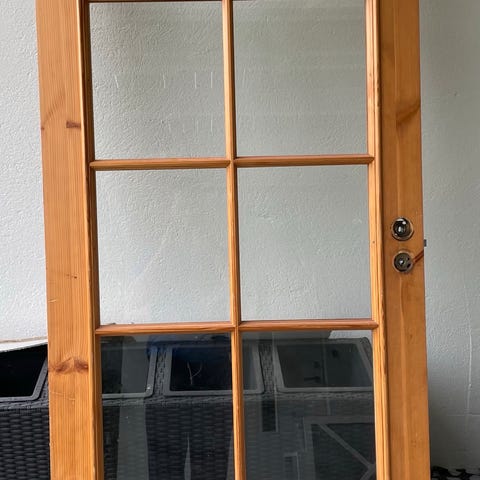 Hvit innerdør med flere glassfelt, laget av tre. Døren har et klassisk design med rektangulære glassruter som gir lysgjennomgang mellom rom. Passer for innvendig bruk i bolig eller kontor.