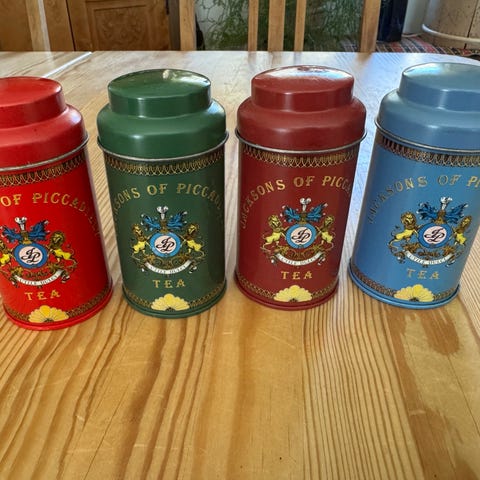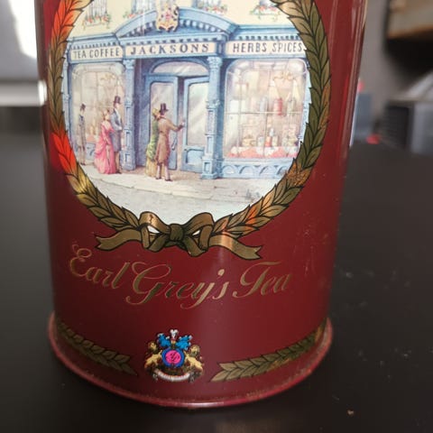 Jackson's of Piccadilly Teboks blikkboks i rød farge. Boksen har dekorativt trykk og lokk, egnet for oppbevaring av te, eller til annet bruk.