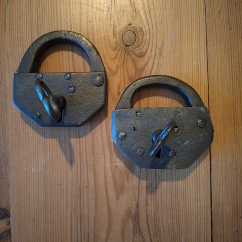 1700 talls hengelåser vurderes solgt. Disse er såkalte taskelåser som trolig er brukt på en kiste. Sansynligvis smidd av samme smed. Begge er i veldig god tilstand med originale nøkler.