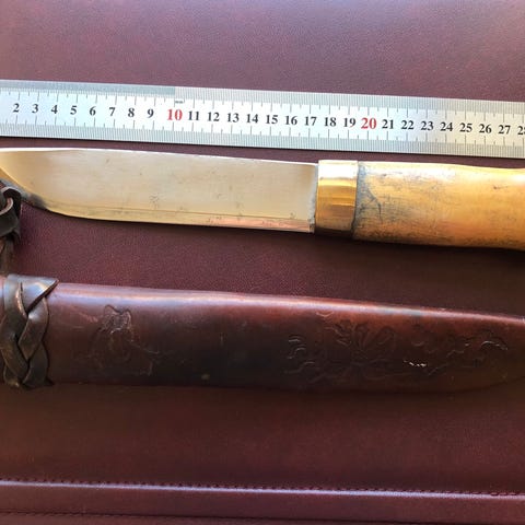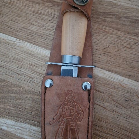 Selger en brukt Helle kniv,usikker på modell. Har skaft med reinshorn innlegg. Kniven har vært i jevnlig bruk og har litt merker her og der.