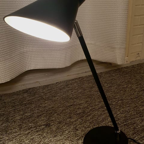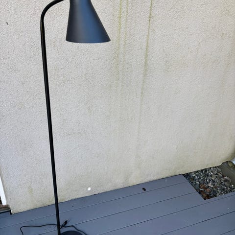 Kjøpt på Lampehuset. Justerbar høyde. Blir litt skjev når den er høy. Et lite hakk på sokkelen. Lysbryter på ledningen på gulv. Må hentes.