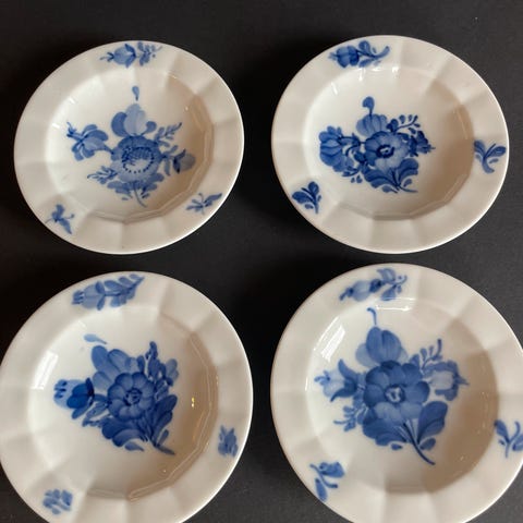 Har 3 sett Blå blomst kantet. Store kopper som kan brukes som tekopper.