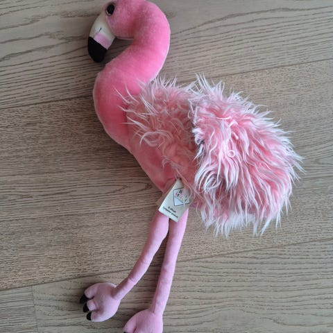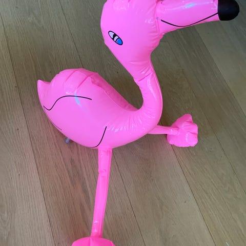 35 cm høy, oppblåsbar flamingo. Brukt som pynt i Hawaiibursdag.