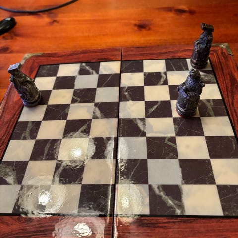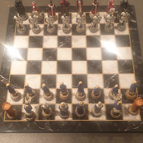 Sjakkbrett i metall og tre med detaljerte brikker i metall. Brettet har en firkantet form med innramming i tre og metallben. Brikkene er utformet med ulike figurer og har en klassisk design.