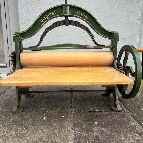 Stolen har dekorative utskjæringer på ryggstøtten. Setet har slitasje.