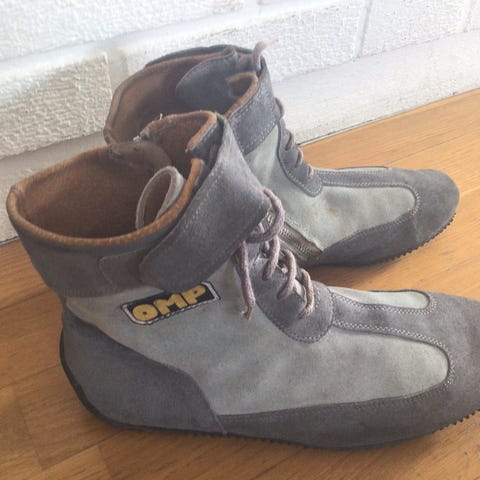 OMP kjøresko til gokart str. 34. Følger med OMP gul/grønne lisser. Godt brukt, men kan fint brukes.
