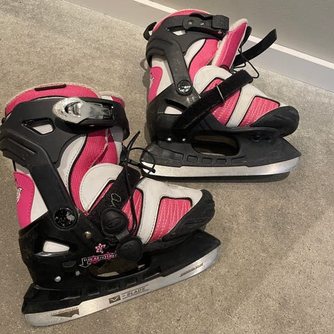 Barne skøyter i justerbar størrelse 28 til 31. Skøytene har en kombinasjon av rosa, hvit og svart farge, med justerbare spenner for god passform. Egnet for barn som deltar i skøyteaktivitet.
