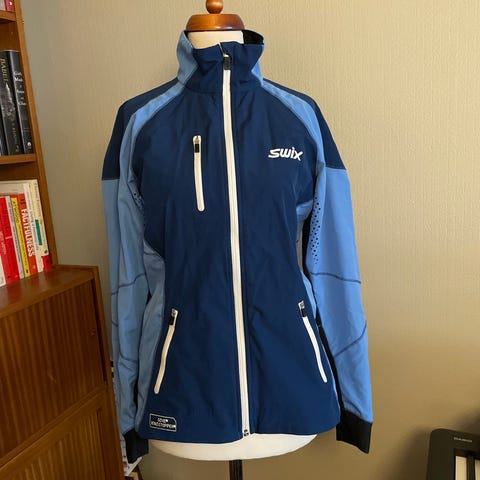 Swix jakke Men i størrelse M, Jakken er laget for ski/løping og har svart farge med hvite detaljer. Materialet er tilpasset for sportsbruk og gir god bevegelsesfrihet. Det er to lommer i front og en lomme bak. Meget pent brukt.