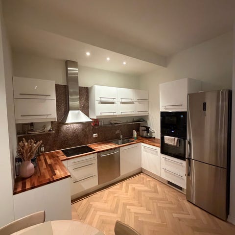 Ventilator( ødelagt) integrert kjøleskap, stekeovn, integrert oppvaskmaskin følger ikke med. Siden vi inntil nylig har hatt frittstående oppvaskmaskin mangler front til integrert, så anbefaler frittstående.