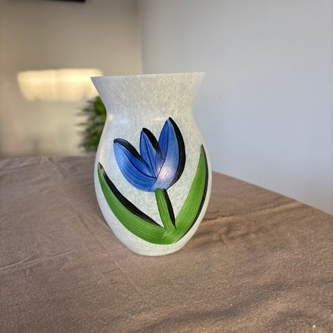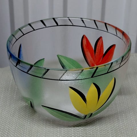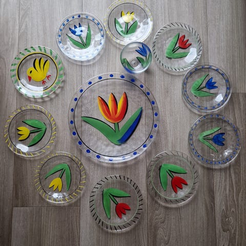 Kosta Boda Tulip glassfat og skål med dekorative tulipanmotiver i rødt, rosa og grønt. Fatene er runde med mønster langs kanten, og skålen er gjennomsiktig med grønt og hvitt mønster. Laget i glass, designer Ulrica Hyman Vallien. Alle er i perfekt stand. 100 kr pr asjett/fat og 200 kr for skåla. Pakkes godt ved evt sending pr post.