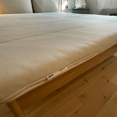 Den er kunn brukt en måned med madrassbeskyttelse på toppen, det finns en hund i hjemmet. Men han er en allergifri liten hund som ikke røyter og sover ikke i sengen. Orginalpris var 3800,- for denne, en superfin overmadrass klassats som den dyraste modellen på IKEA. Utgått modell dessutom og den har oppbevarats vel.