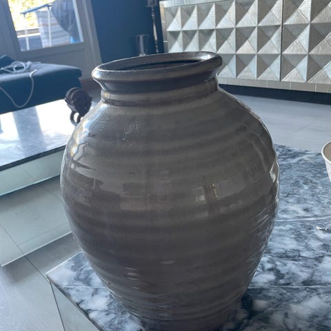 Stilig og dekorativ Otto-vase fra Princess, i beige/grå keramikk med ansiktsmotiv.