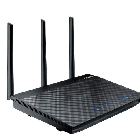 ASUS Router med fire antenner, svart farge. Inkluderer strømadapter. Designet for trådløst nettverk.