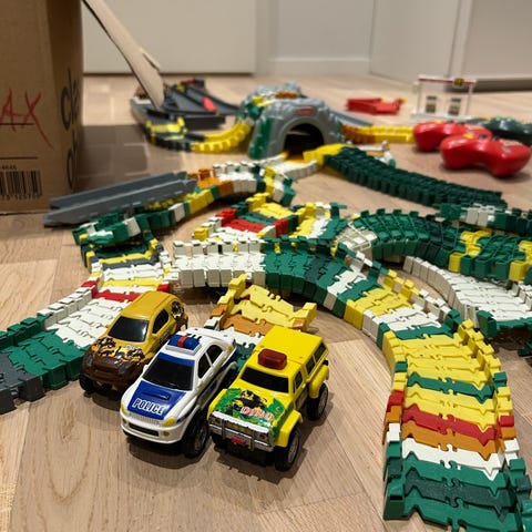 Har mye traktorer, brannbiler, dinosaurer, jungeldyr, småbiler som det er mye lek igjen i. Greit å ha hos bestemor og bestefar, hytta, sandkassen.