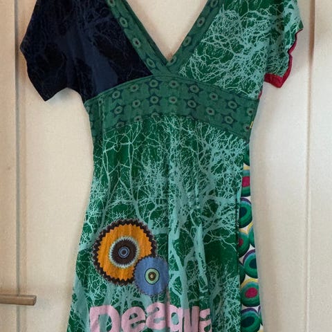 Desigual Kjole i størrelse S, laget av bomull med flerfarget mønster. Kjolen har kort erme og et unikt design med ulike farger og mønstreSelger en flott og særpreget kjole fra .