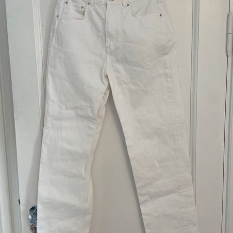 Begge buksene i str 34. Den rne buksa litt mer ‘rufsete’ stil enn den andre. Litt slitt i enden på beina som normalt etter bruk.