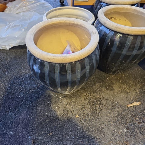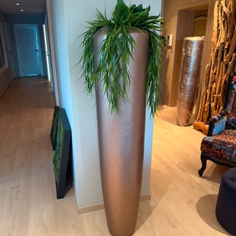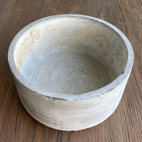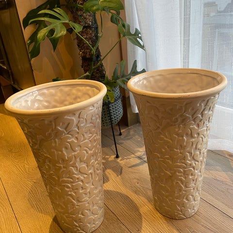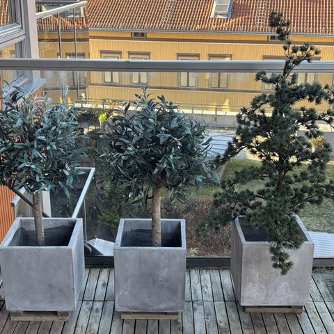 Sett bestående av to betong blomsterpotter og en betong lysestaker. Blomsterpottene har en sylinderform og er grå i fargen. Lysestakene har en klassisk design med dekorative detaljer. Materialet er betong, som gir et robust og industrielt uttrykk.