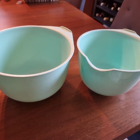 Solide og robuste bake-/oppbevaringsboller med lokk. Kan stables oppi hverandre, så de tar lite plass.