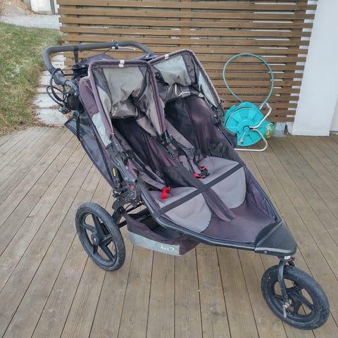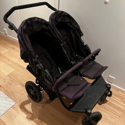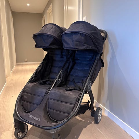 Baby Jogger Tvillingtrille i sort farge. Barnevognen har to seter side om side, egnet for tvillinger eller to små barn. Designet for enkel manøvrering og komfort for barna. Laget med slitesterke materialer. Veldig praktisk og kompakt vogn
