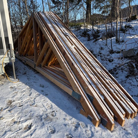 Selger vår store drøm med tungt hjerte, da vi ikke fikk tillatelse til å sette opp huset på tomta vår. Gammelt trehus med grunnplan på ca 74 m2 med to etasjer og loft. Bygningen er laftet med tettvokst og godt utmalma 6" furu i kamlaft og er bygget i 1925. Kun spor etter øks og håndsag. Har stått kledd hele tiden bortsett fra de 3 siste årene før nedplukking. Ble plukket ned i oktober 2023 og har vært lagret lufting under tak. Tømmeret er i utrolig god stand. Kun 2 bunnstokker og en stokk under ene vinduet i 1. etg som må byttes. Alle stokkene er merket og skrevet ned på ark. Vi har over 200 bilder fra nedplukking. Huset ligger klar i pakker og er klar for bortkjøring. Går akkurat på ett lass med stor bil. Original trapp er demontert og følger med.