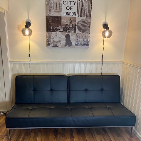 Beddingen sovesofa med madrass, to trekk (et mørkt turkist og et grått), skuff og overmadrass. Brukt som gjesteseng, er i fin stand, liten rift i madrassen, se bilde 5. Noen merker på trekk og overmadrass. Blir 140 x 200 når den slås ut.