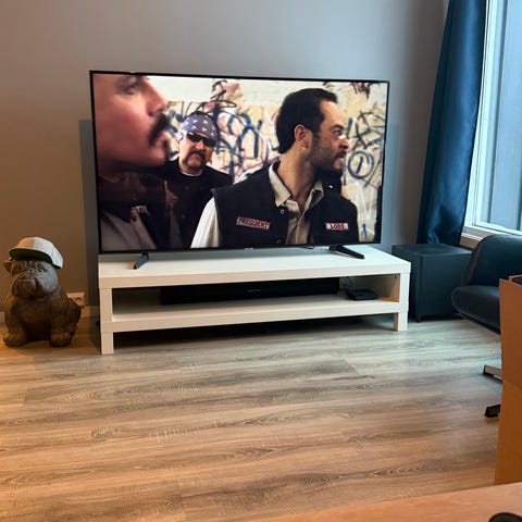 Samsung Smart TV 65" ink mediabenk, og JBL lydplanke/subwoofer.
