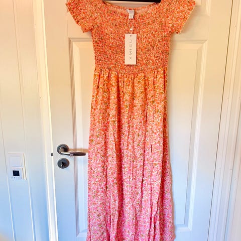 Kjolen er ny med lapp. Størrelse 38. Brystmål fra armhule til armhule er 33-45 cm, hel lengde fra skulder og ned er 123 cm. 100% viskose.