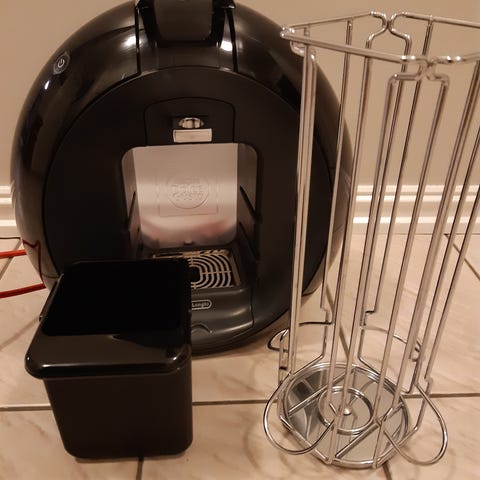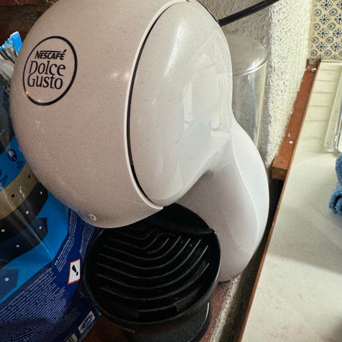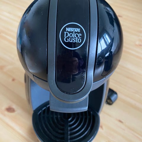 Nescafé Dolce Gusto Genio S kapselkaffemaskin i svart farge. Maskinen er designet for bruk med kapsler og har et kompakt design som passer til kjøkkenbenken. Den har en avtakbar dryppskål og enkel betjening med knapper på toppen.