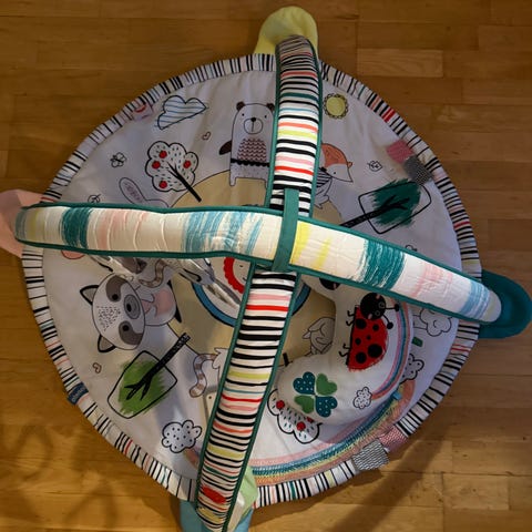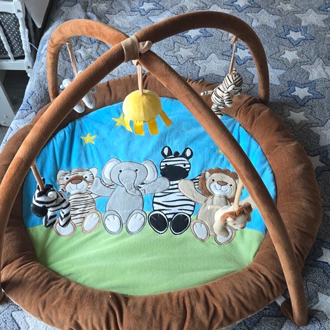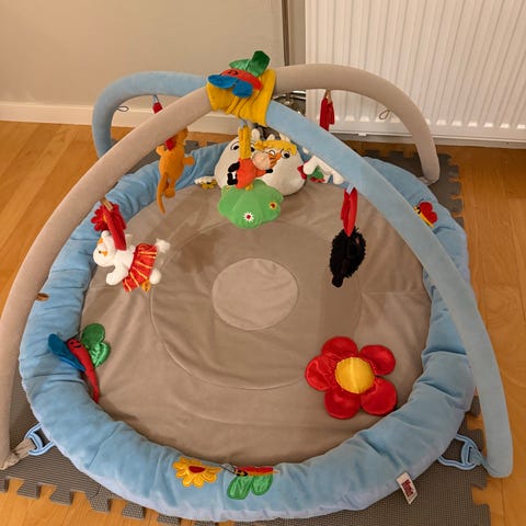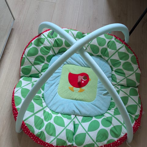 Trongle aktivitetsgym og sammenleggbar lekematte med fargerikt design og hengende leker. Inkluderer 4 baller og 4 aktivitetsleker, hvorav to er ødelagt/mangler en del (se bilder). Er likevel fullt mulig å bruke/reparere - og har masse bruk igjen.