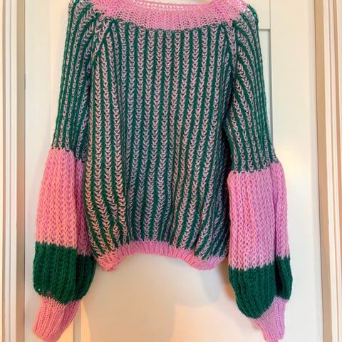 Løs passform. ballongeffekt nederst på genseren og den nedre delen av ermene.