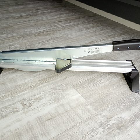 Du plasserer laminatkutteren på gulvet du jobber med, mål til laminatet og press håndtaket form å kutte gjennom. Det er lett og enkelt og det gir deg flotte skarpe kanter å jobbe med, man får et eksakt rett kutt, enkelt og greit.