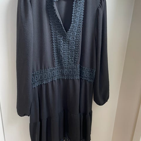 Kjole med glidelås i rygg. Svart bunnfarge med oransje blomster. Ubrukt med lappen på. Nypris 1399,-