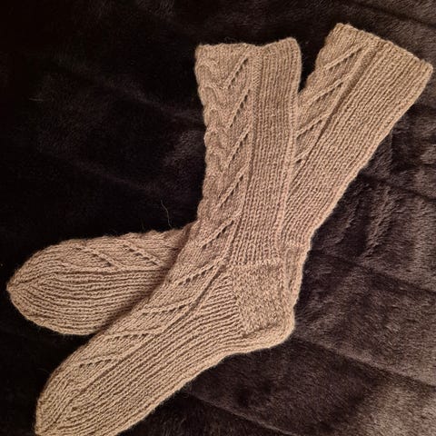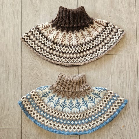 Halsen er strikket I Air fra Drops. Det er 65% alpakka. 28% polyamid og 7% ull.