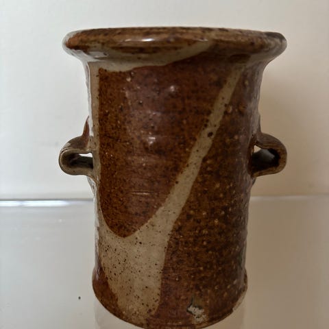 Keramisk skulptur med abstrakt menneskefigur i brunfarget leire. Skulpturen har en høyde på omtrent 30 cm og viser et stilisert ansikt og kropp med geometriske detaljer. Egnet som dekorativt kunstobjekt.