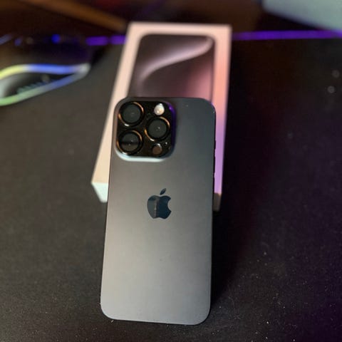 Apple iPhone 15 Pro med 128 GB lagringsplass, i grått. Batteritilstand på 86 %.Uten kutt eller blåmerker på sidene og kantene.Den følger med eske, faktura og beskyttelsesdeksel.